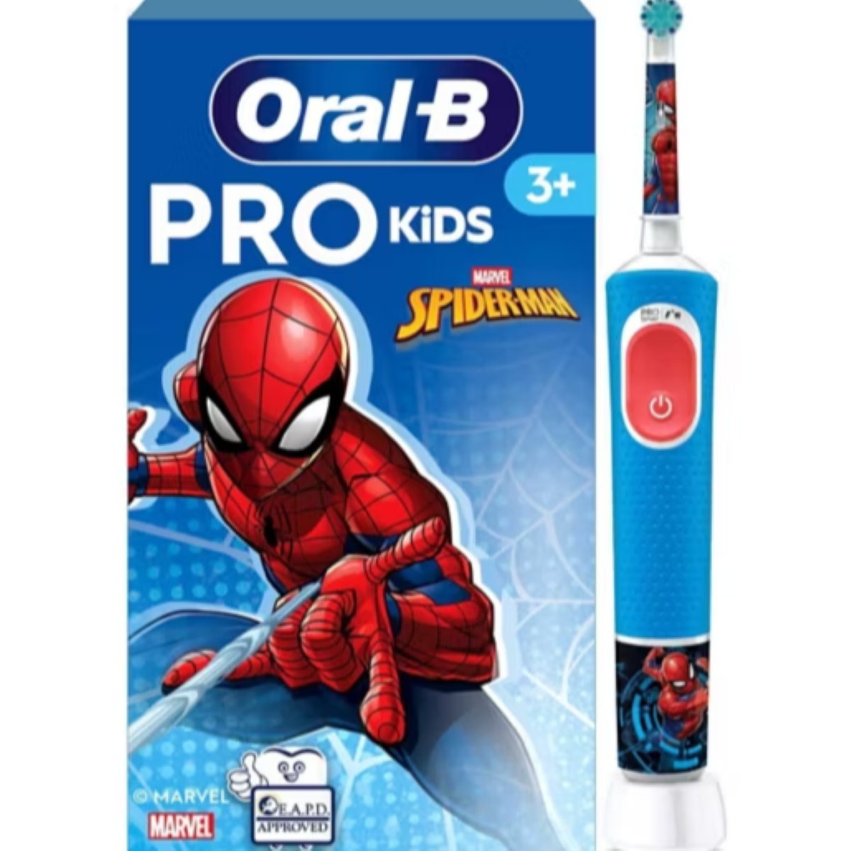 Pakkaus sisältää Oral-B Vitality Pro Kids -sähköhammasharjan, laturin ja vaihtoharjan. Spider-Man sähköhammasharja pakkauksessa mukana lisäksi matkakotelo.